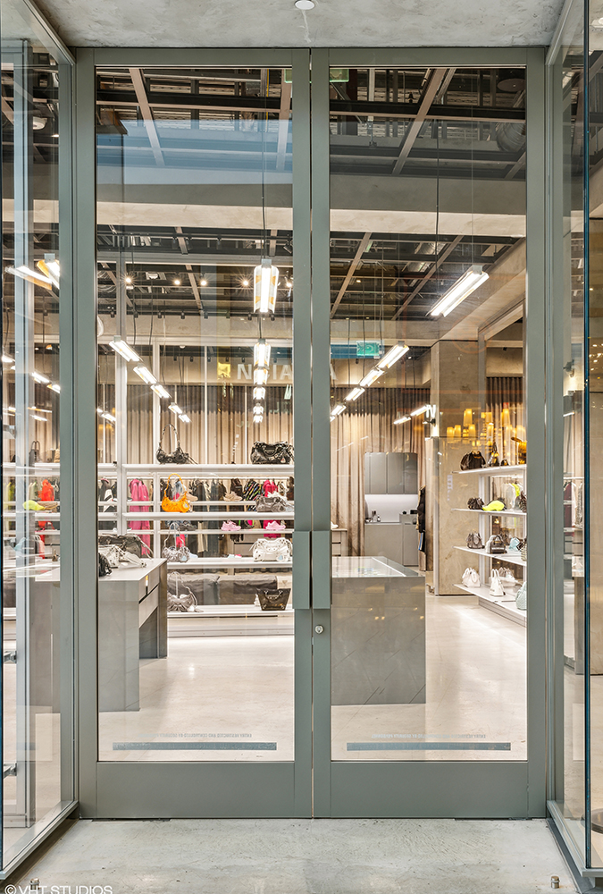 SCOPE: This two façade project in Santa Clara, CA featured a custom designed industrial blackened stainless steel panel system, while the interior façade featured a traditional yet custom storefront system with laminated low iron security glass, charcoal gray metal finishes, custom doors, and hardware.