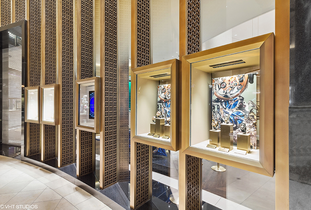 SCOPE: This one-of-a-kind façade design included a custom extruded security curtain wall frame, integrated display vitrines, laser-cut decorative metal accents, security laminated printed glass, and antique bronze patina metal finishes, all facetted to follow a curved lease line.