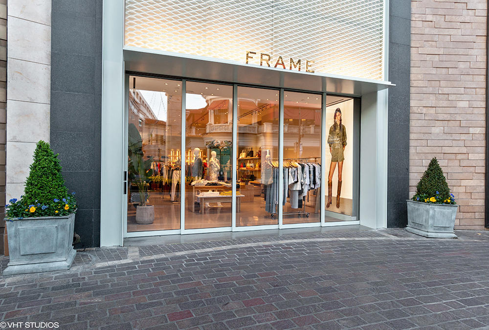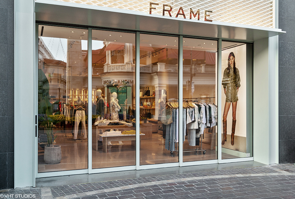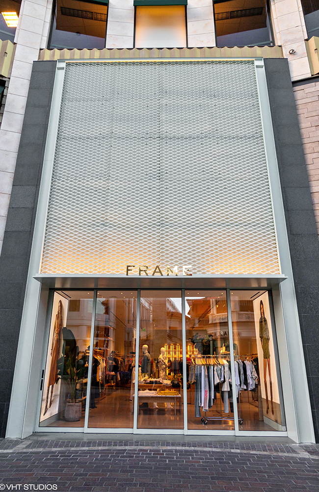 SCOPE: We recently completed the storefront work at Frame’s new location at The Grove in Los Angeles with Hirsch Construction Corp. We provided new custom sliding aluminum pocket doors with insulated glazing that exceeded California’s Title24 requirement for energy efficiency, custom painted aluminum cladding panels, and upper painted aluminum expanded metal facade panels.