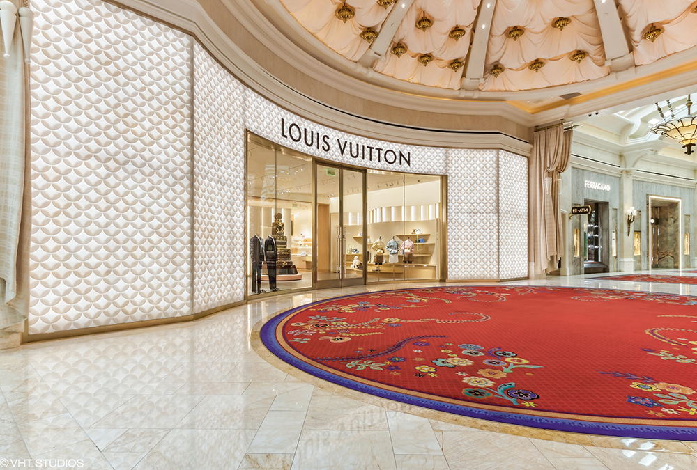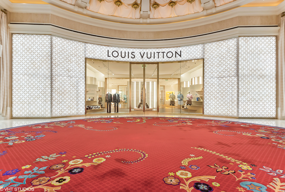 SCOPE: Louis Vuitton at the Wynn Casino in Las Vegas featured a curved façade with structural laminated low iron security glass, brushed bronze metal finishes, and custom entry doors and hardware.