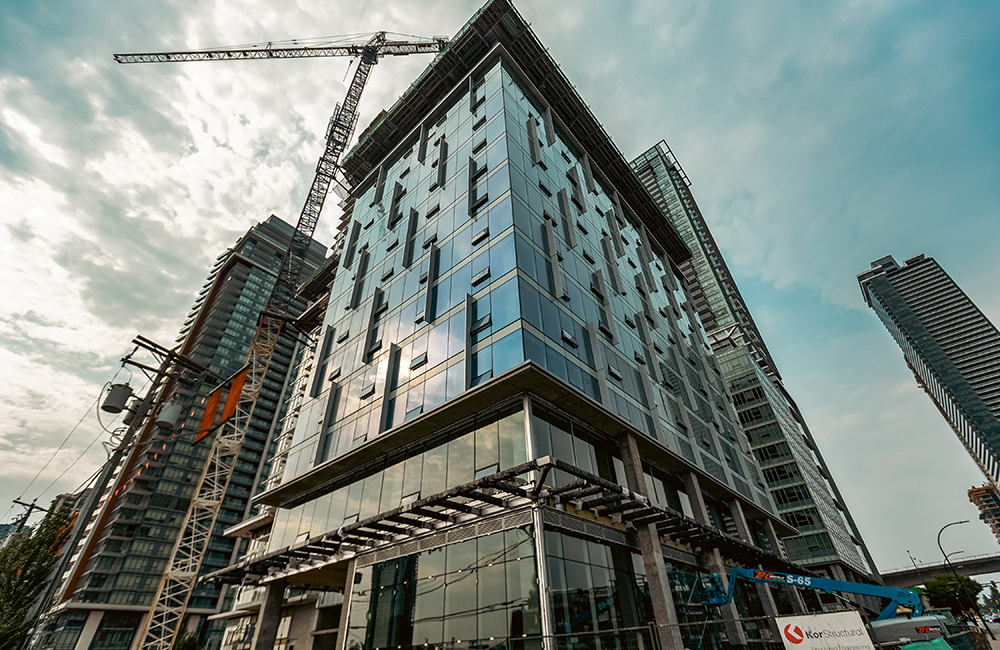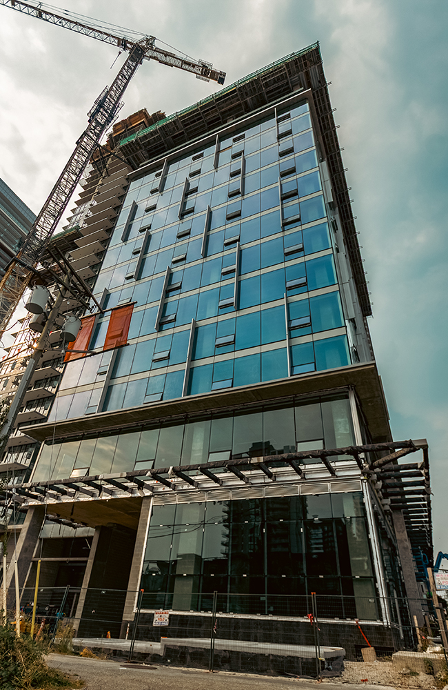 SCOPE: Exterior stick framed aluminum curtain wall at podium, and unitized curtain wall at office tower, aluminum swing doors, glass canopies, operable vent windows, and windscreen glazing.